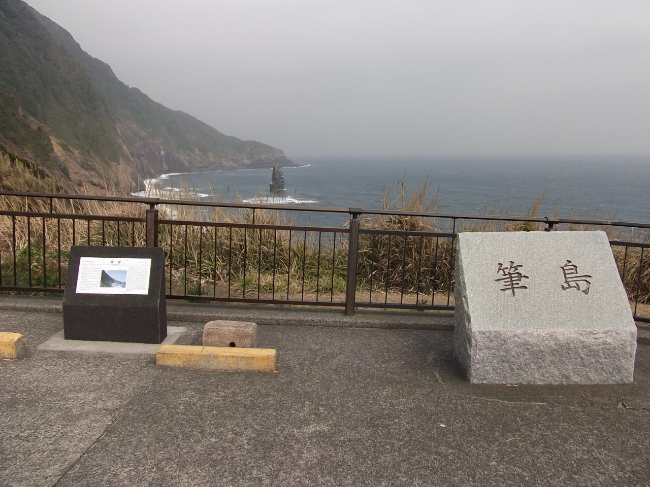 波しぶきが割れる岸壁近くにぽつんと立っているのが筆島で、左回りに進むならば筆島が見えてから少し行ったところに車も少し停められる展望台がある。