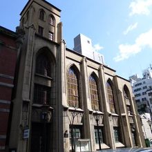 淀屋橋駅から歩いて5分ほど、ガス燈が並ぶ三休橋筋に面して建っています。1877年松村診療所内に浪花公会の名称で設立され、今の教会は、1930年に建てられたそです。ゴシック様式の尖塔窓と黄色や緑色の色ガラスで飾られた高い塔屋が特徴的な教会です。