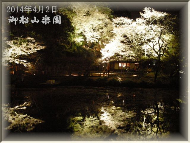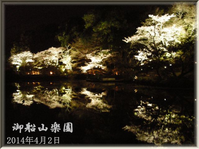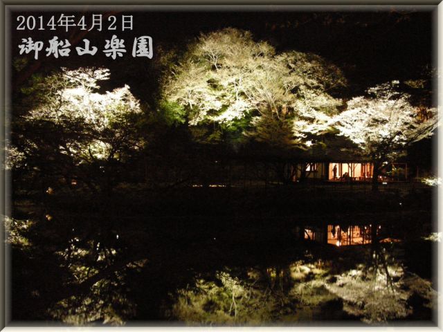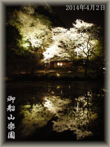 - 無風で庭園の池に映るライトアップされた夜桜は見事に美しかったですよ。これで満月のお月さまが一緒に映れば最高でしょうがね・・