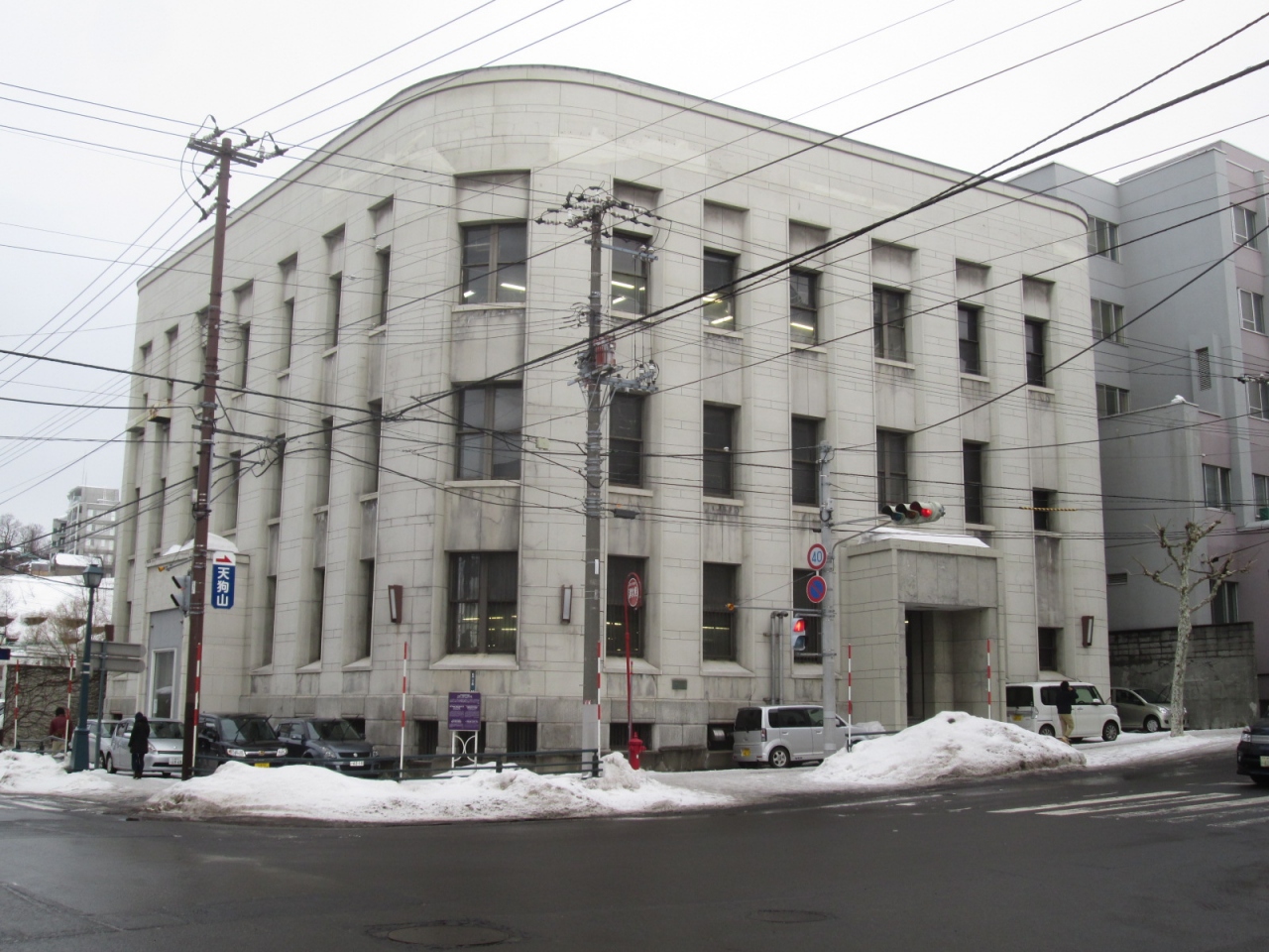 「旧第一銀行小樽支店」は”北のウォール街”の中心地、色内大通りと日銀通りとの交差点の角にあります。他の角地に建っている「旧北海道拓殖銀行小樽支店」、「旧三菱銀行小樽支店」と比べると、この「旧第一銀行小樽支店」の地味さが際立ちます。ただ解説板には”外観デザインは飾り気のない壁面に改変されていますが、当初は道路側2面に3階通しの大オーダーが立てられていました…”とあり、かつては3階までの大きな柱と梁で装飾された重厚な建物であったこと分かります。見たかったなぁ…。