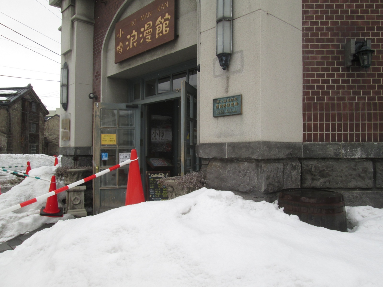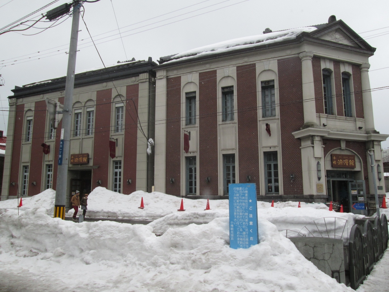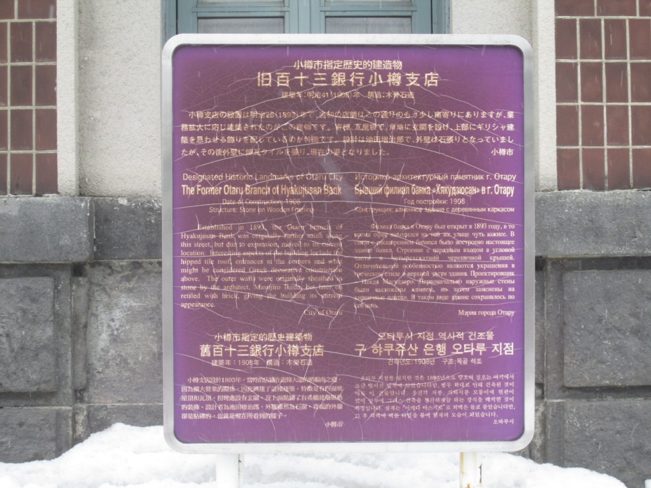 「小樽」駅から”北のウォール街”交差点を右折すると、前方に「旧百十三銀行小樽支店」という美しい建物が目に入ります。明治41年の建物で、改修されているとはいえ、美しい姿を保っているのは素晴らしいですね。館内はアクセサリーショップになっているようで、オジサンが一人で入るのは難しく、外観だけの見学になりましたが、解説板前が雪で埋もれており、文字を読むのに苦労しました(笑)。明治41年生まれなのに現役…明治期の建築技術の高さに脱帽です。