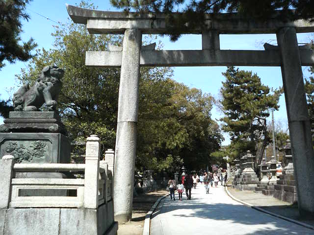 北野天満宮の入口に建つ、古めかしい石鳥居です。