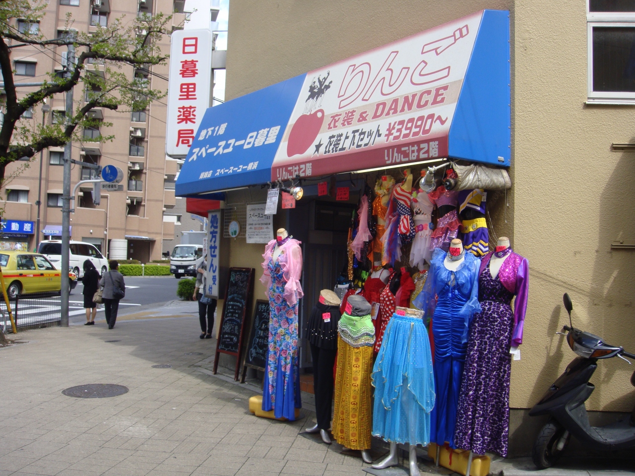 日暮里駅南口から歩いて3分ほどのところから、道路の両側約1kmにわたって店が立ち並ぶ専門店街です。80店舗ほどあるようで、繊維街のお店に置いてある「にっぽり繊維街まっぷ」を見ながら回るのが効率的かと思います。ご覧のようなステージ衣装を売っている店も多くあり、見ているだけでも楽しいです。