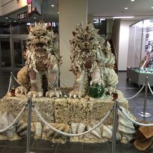 飛行機から降りたつと、到着ロビーでは貝殻でできた大きなシーサーが迎えてくれます。迫力があり愛機をもあるのでみんな記念撮影をとってます。