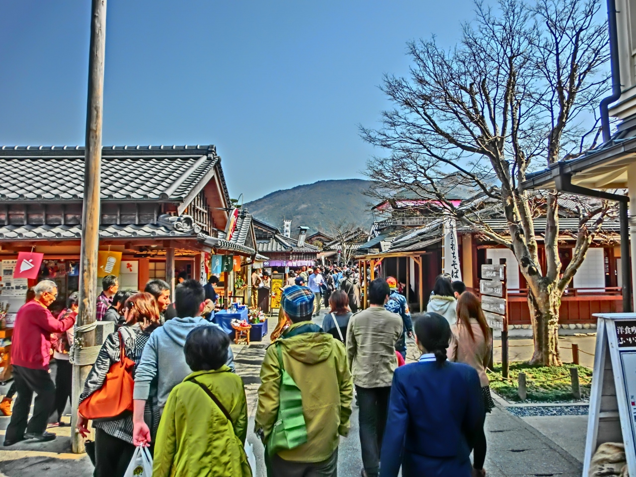 伊勢神宮の内宮からおはらい町を通って赤福さん本店の前あたりから左側が「おかげ横丁」ですね。真ん中くらいに大きな太鼓が置かれてて決まった時間にアトラクションが行われてます。買い物スポットとしても楽しいけど、「豚捨」さんのコロッケや伊勢うどんで有名な「ふくすけ」さんがあったりとグルメのスポットとしても見逃せませんね~♪