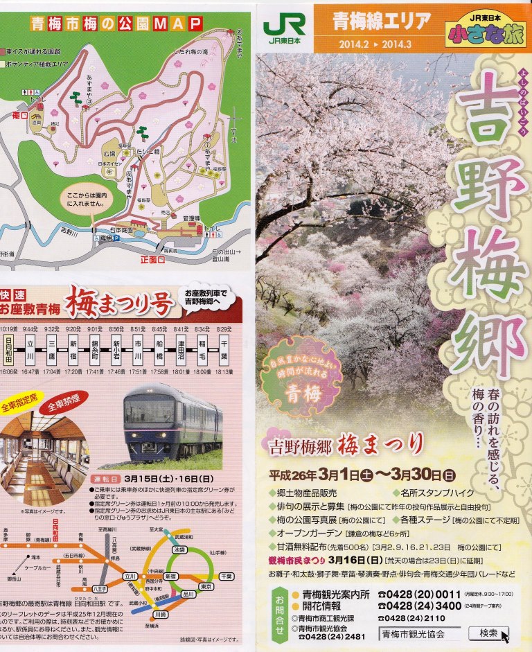 吉野梅郷(よしのばいごう)とは、JR青梅線日向和田駅から二俣尾駅までの多摩川南側、東西4キロメートルに広がる地域で、青梅市梅の公園をはじめ、吉川英治記念館、青梅きもの博物館などの観光スポットが点在しています。