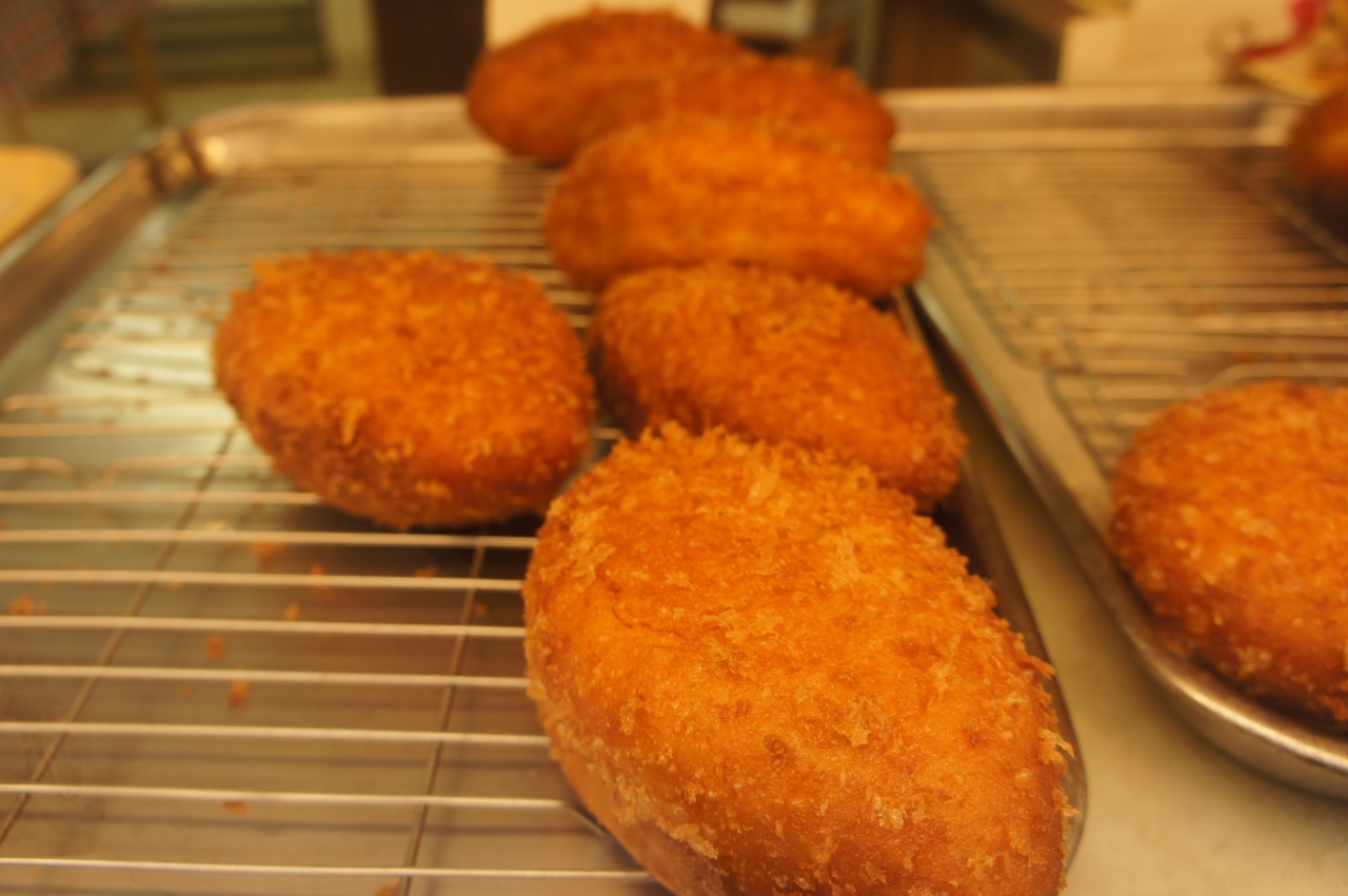 天神橋筋商店街を歩いていて見つけたとっても元気なパン屋さん。ニッシンベーカリーという昭和43年創業の老舗だそうです。店頭には、お勧めのカレーパンの看板があって、これをいただきました。ちょっと大きめのパンは、うすでの生地。玉ねぎがたっぷり入っているとろんとしたルーがまろやかでした。正統派のカレーパンです。