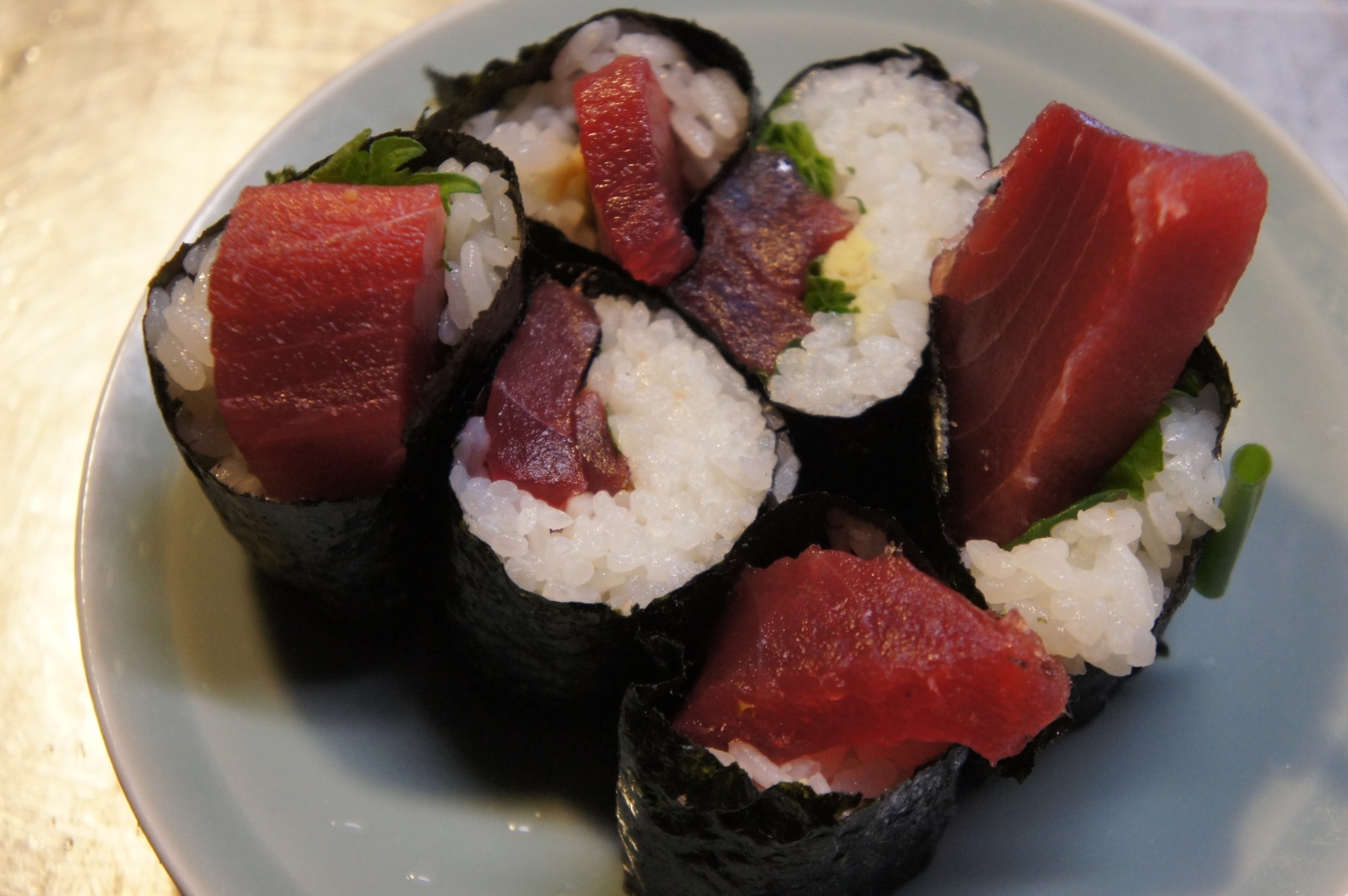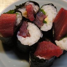 私は一人だったので、屋台の片隅。傘を差しながら、お勧めという天然たいの刺身と鉄火巻をいただきました。屋台なのに、生ものが主体なんですね。活きのいい鯛のうまさはなかなかだし、無造作に巻かれた鉄火巻はマグロがはみ出して、かなり豪快。女性店員さんの気持ちのいい対応も印象に残って、人気店の理由は明らかです。