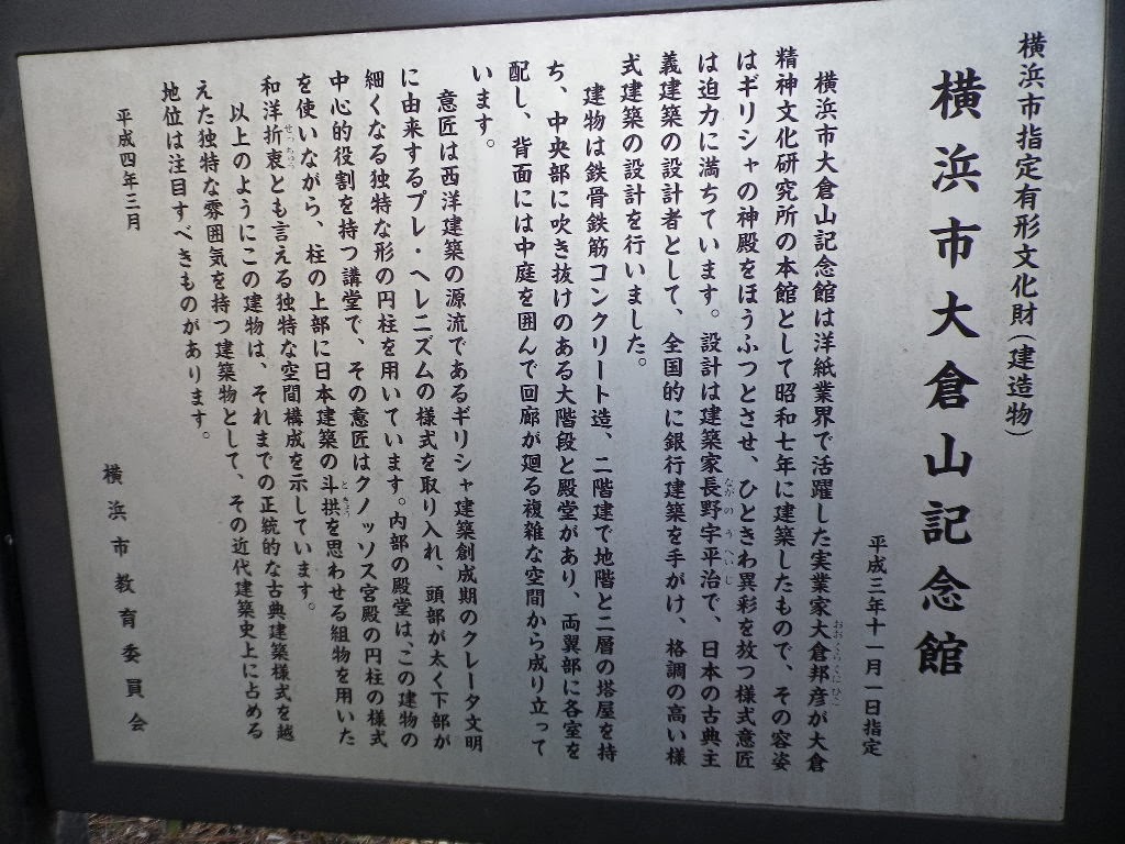 東急東横線のすぐ横の坂を上ると大倉山記念館がある。記念館の裏には梅林があり、季節には屋台も出て多くの人で賑わう。記念館周辺は地元の人の憩いの場となっている。晴れた日に横浜市内を展望するのもまたたのし。