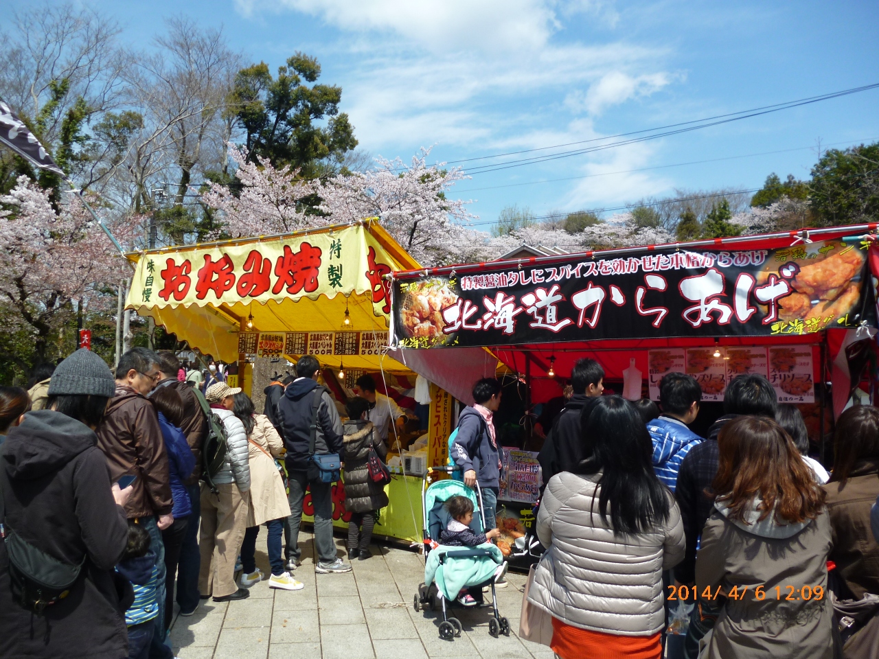 この時期は、ちょうど桜も満開で、各種の屋台も沢山出て、花と団子が楽しめます。