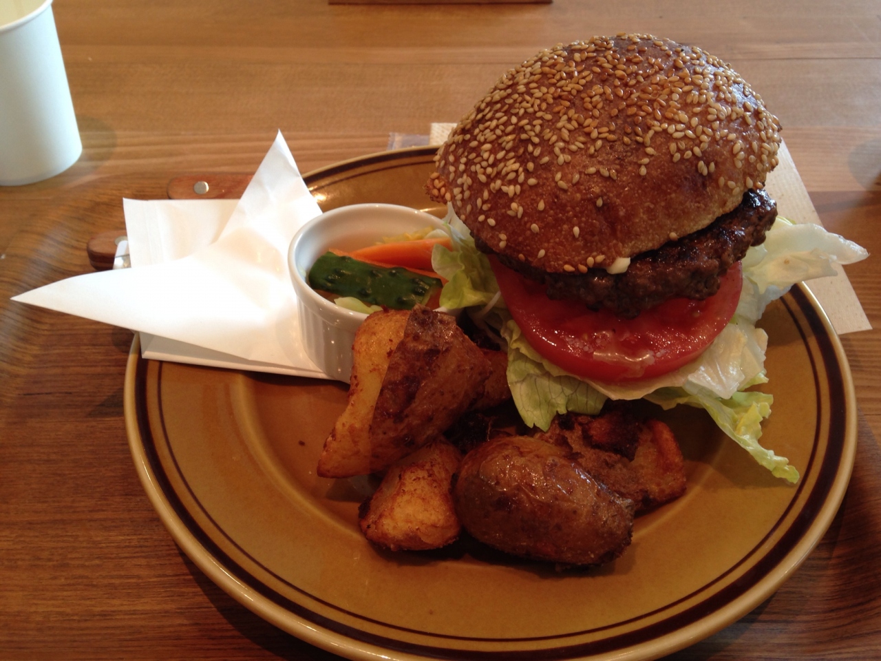 さすがベーカリーのパンを使っているだけあってパンがとても美味しいです。パテはお肉!という感じがしっかりして、レタスやトマトもたっぷり挟まっています。マヨネーズもオニオンスライスも良く合いました。ポテトのフライもカリッとして美味しかったです。次はベーカリーからサンドイッチを購入してみようかな?
