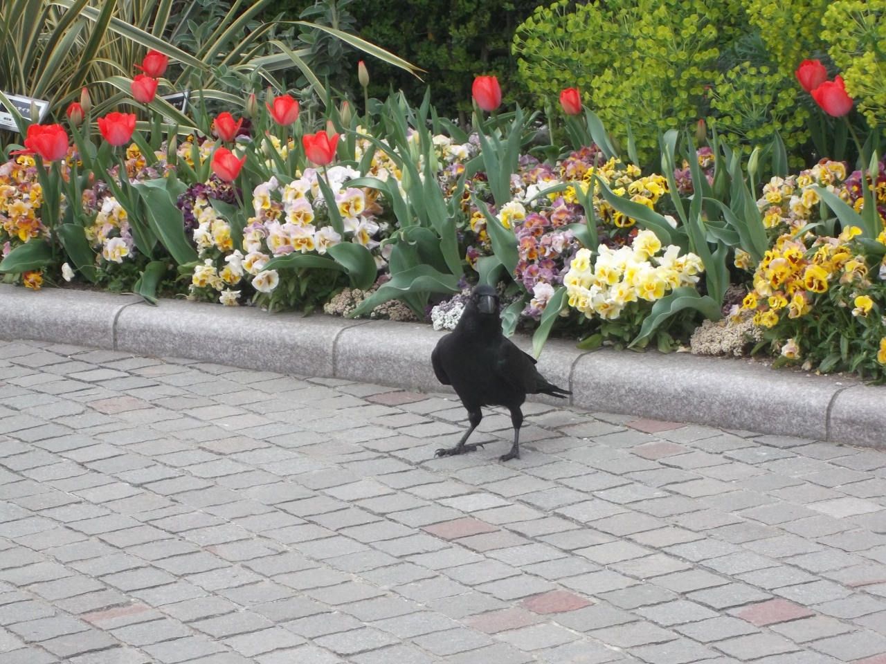 エレベーター開いたら、そこは洋風庭園公園。あれ!ここって屋上なの?・・・みなとみらい線元町・中華街駅(アメリカ山公園口)の駅舎(ビル)上、ここは全国初の立体都市公園。芝生花壇がありチューリップが咲いています。紫はラベンダー(少しですが)。