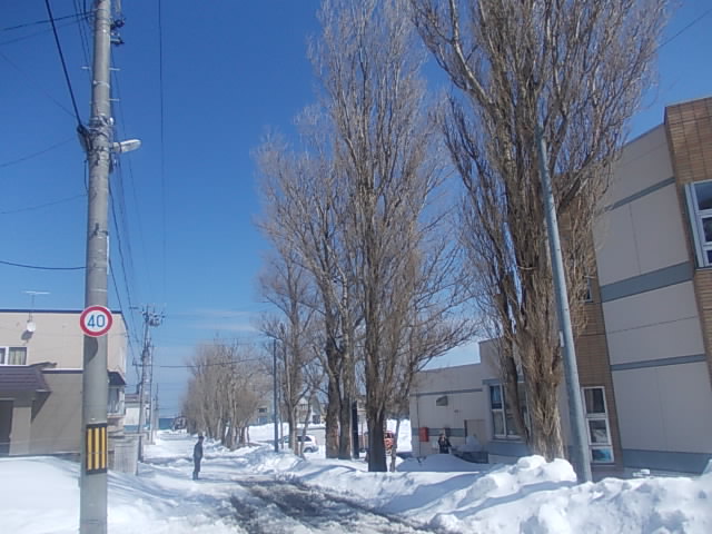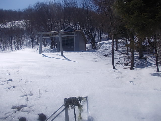 ここは少し高台に立地しているので、付近からの景観はなかなか良いのですが、如何せん、積雪期は立ち寄る人が殆どいないようで、境内に至る登り階段上には、踏み跡がまったく残されておらずに、4月上旬という時期でしたが、ツボ足でズボズボと足を取られながら、大変な思いをして本殿まで近付かざるを得ない、大変な悪条件でした。特に下りは滑り易く、転倒しやすいので、この時期はちょっとお勧めできない神社です。因みに、この神社に至る登り坂の途上は、小学校の脇の道を通ることになりますが、ここのポプラ並木がとても美しいので、新緑の季節や秋などに御訪問されると、とても情趣の感じられる素敵なスポットだと思います。