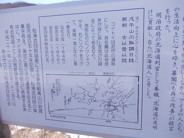 こちらのお寺に関しては、フォートラベルさんのサイトに記載されている住所を頼りに探してみたのですが、当該箇所には原っぱが広がっているという感じで、お寺を見つけることが出来ませんでした。ただ、近くには北海道の命名者としても知られる松浦武四郎の幕営地なる記念碑も建っていたり、雪に埋もれた声問神社がすぐ近くにあったりと、声問岬を有するこの地区内の多くで漁村の雰囲気が広がる中、少し歴史の深さを感じる景観を味わうことが出来ました。