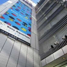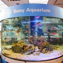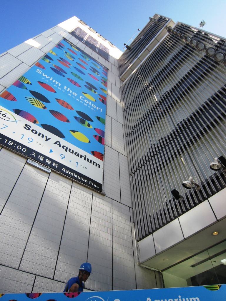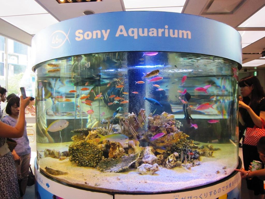 数寄屋橋交差点にあるソニービルは、毎年夏には入口屋外に大型水槽、屋内にも水槽が設置されアクアリウムになります。水槽の中を色鮮やかな熱帯魚が行き来する様を子供達は興味深げに見ています。上階のシアターではソニー最新鋭のカメラを駆使した映像を楽しむこともできます。