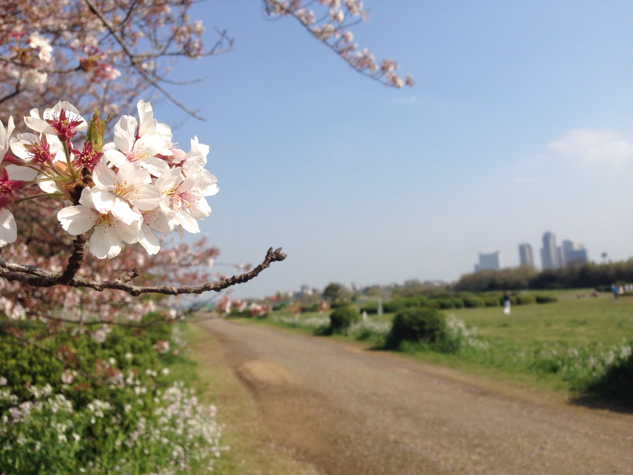 開けた空間で、青空と桜のピンクがマッチしていて、癒される場所です。