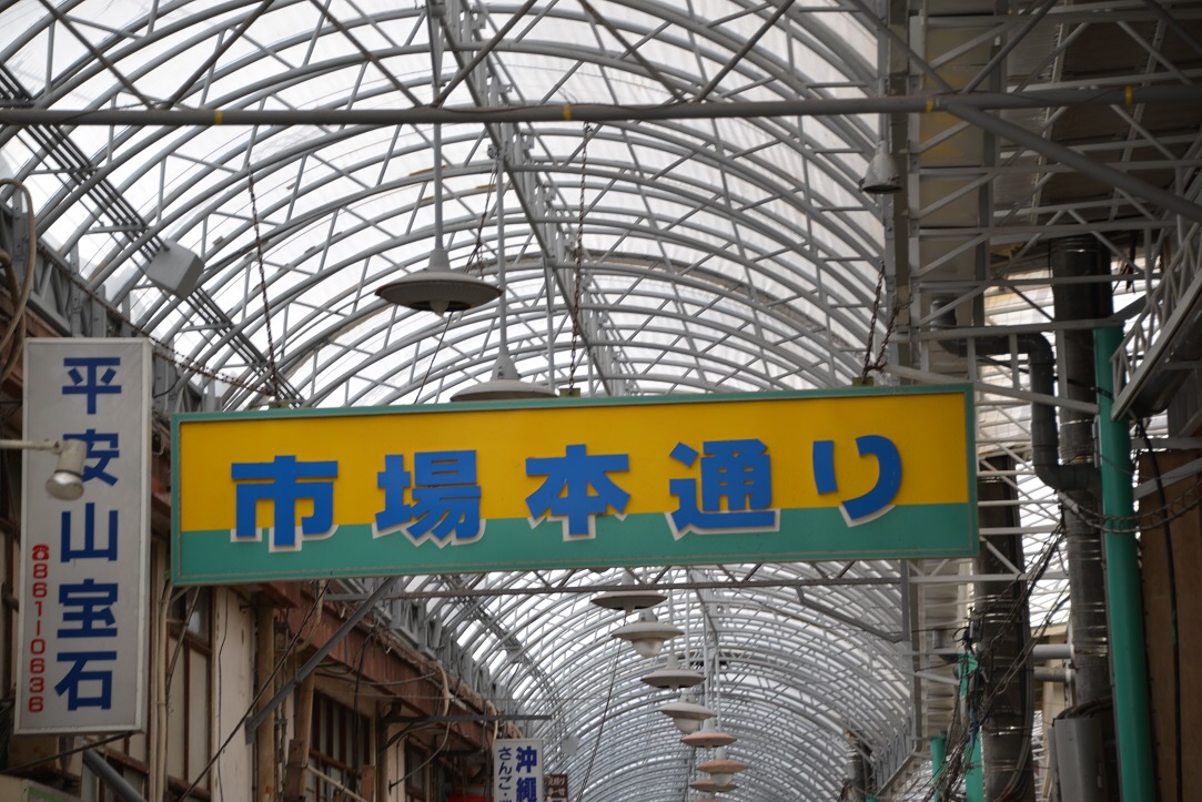 平和通りのひと筋西側で、牧志第一公設市場に直通のアーケード街です。平和通りに比べるとやや庶民的な店が多いかなと思いますが、賑やかな買い物を楽しめる通りです。パイナップルやマンゴーなどを購入するならこの通りの奥(公設市場より南)の八百屋さんが親切です。