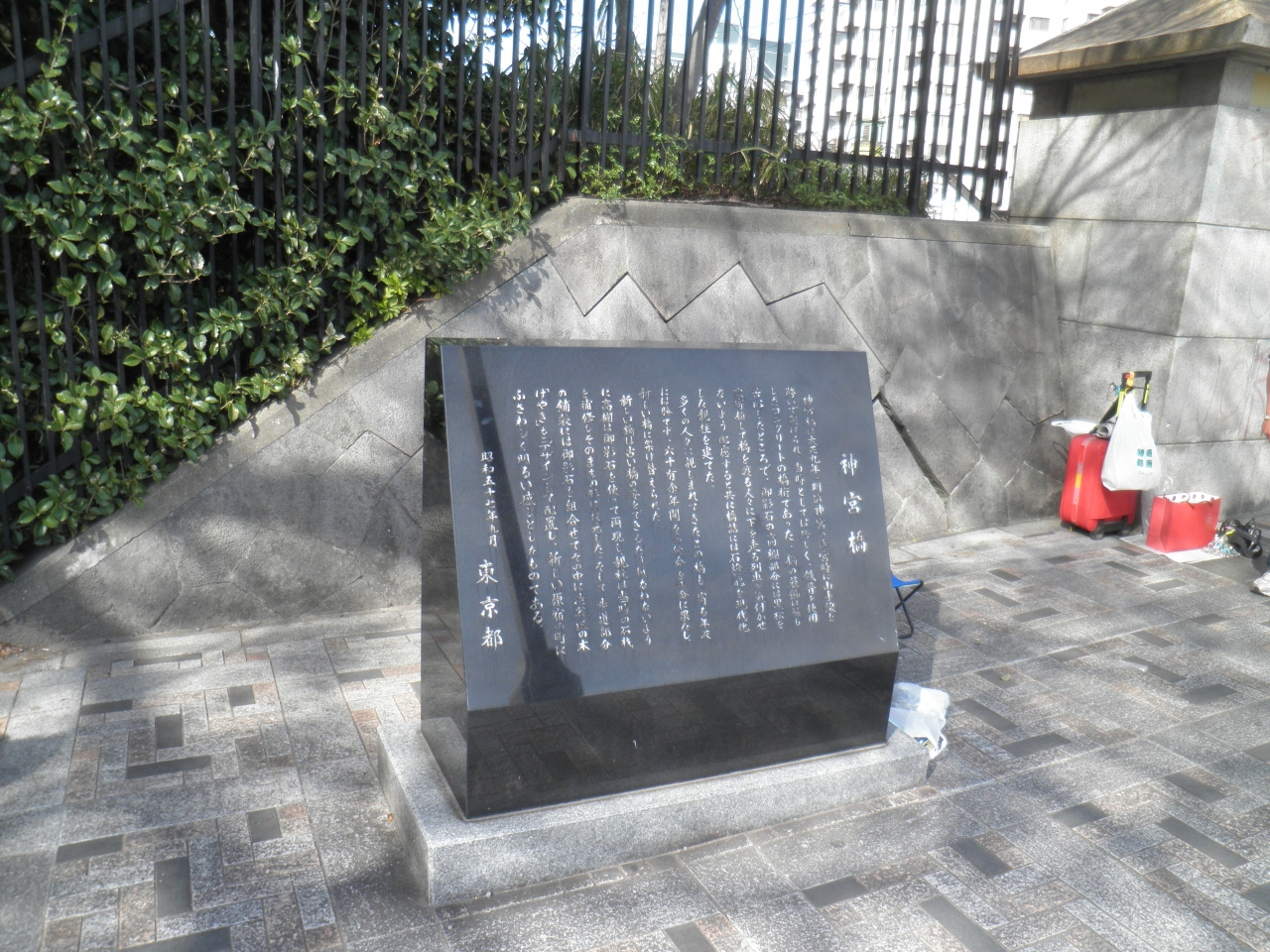 新宿方面から代々木公園へ行って、花見をした後、原宿口から出て明治神宮に行きました。 神宮から原宿駅方面に行くところに、広くて大きな橋が架かっていて、わきに由来のかかれた大きな黒い石が置かれています。 土曜日だったので、参拝客や代々木公園へ行く人々が大勢渡っていました。