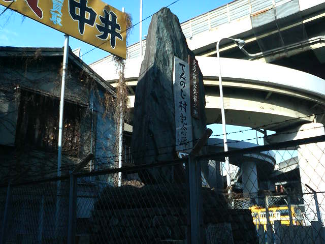 高速道路のガード下に建つ石碑で、かつて大阪の芸人たちが住んでいた場所ということを伝えていて、石碑のそばには大入袋が捧げられていました。