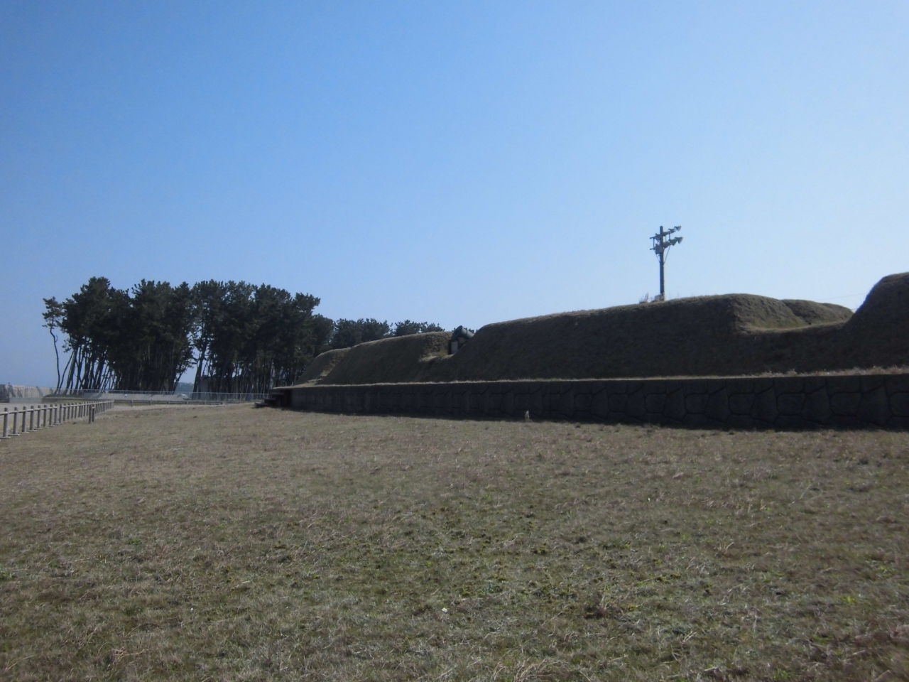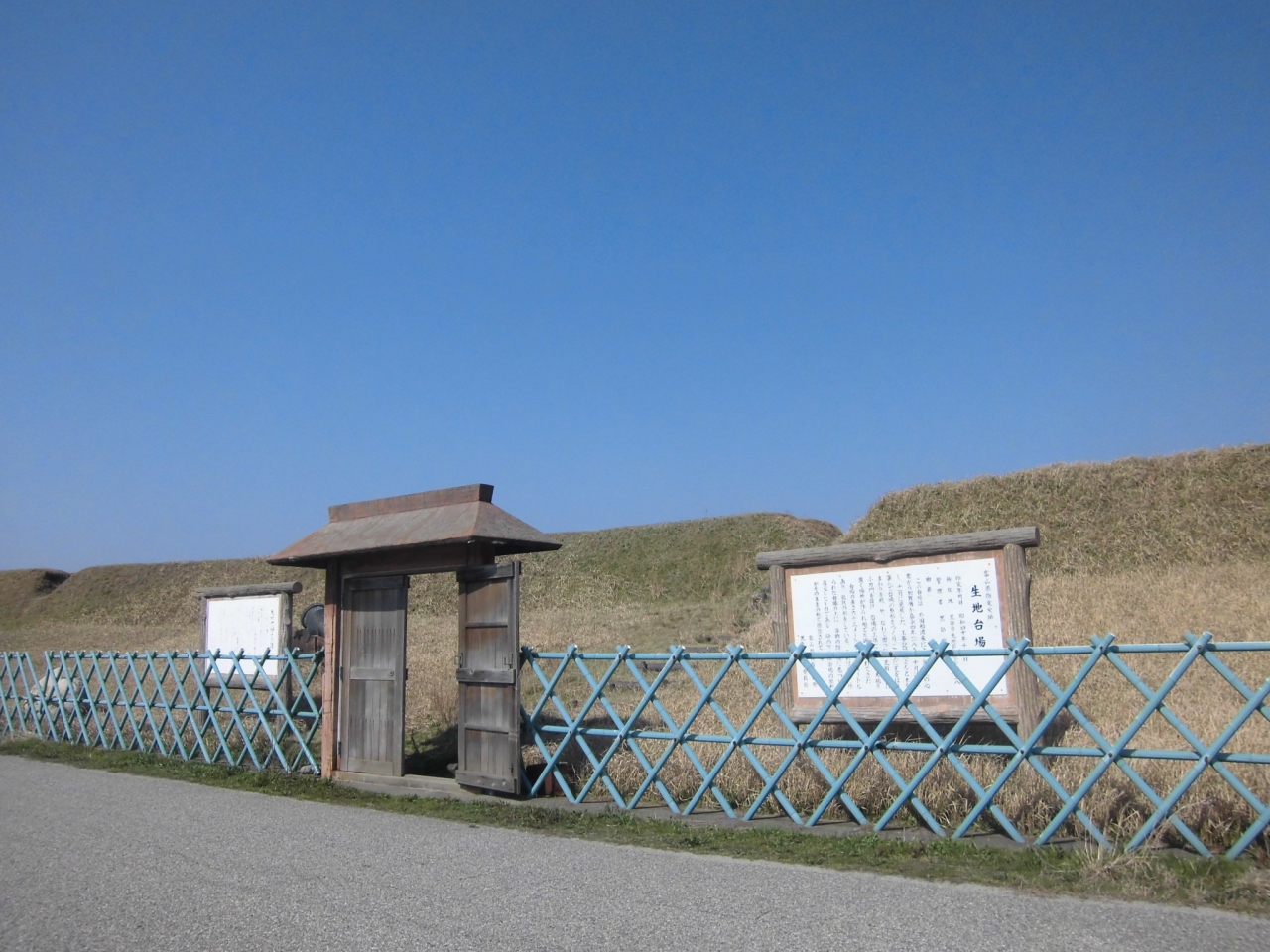 黒部市に出かけた時に、生地台場の看板を見かけちょっとっ立ち寄ってきました。江戸時代末期、嘉永3年8月に加賀藩が外国船の来訪に伴い、海防のために領内海辺に大筒台場を築造したうちのひとつがここ生地台場だそうです。幅8メートル、長さ約63メートル、高さ約2.5メートルという巨大なもので、現在はその姿が復元されていました。富山県指定文化財になっています。