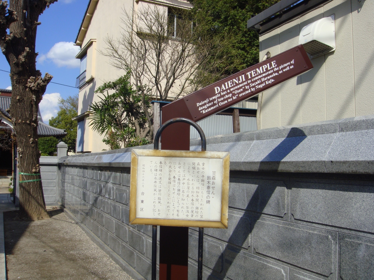 谷中にある大円寺の前に「笠森お仙、鈴木春信の碑」があります。お仙は、笠間稲荷社前の茶屋「鍵屋」の看板娘で、江戸の三美人の一人。絵師鈴木春信はその姿を当時全く新しい絵画方式である多色刷り版画「錦絵」に描きました。そのお仙に関係の深い笠森稲荷を合祀している大円寺に2つの碑が建てられた。と書いてありました。
