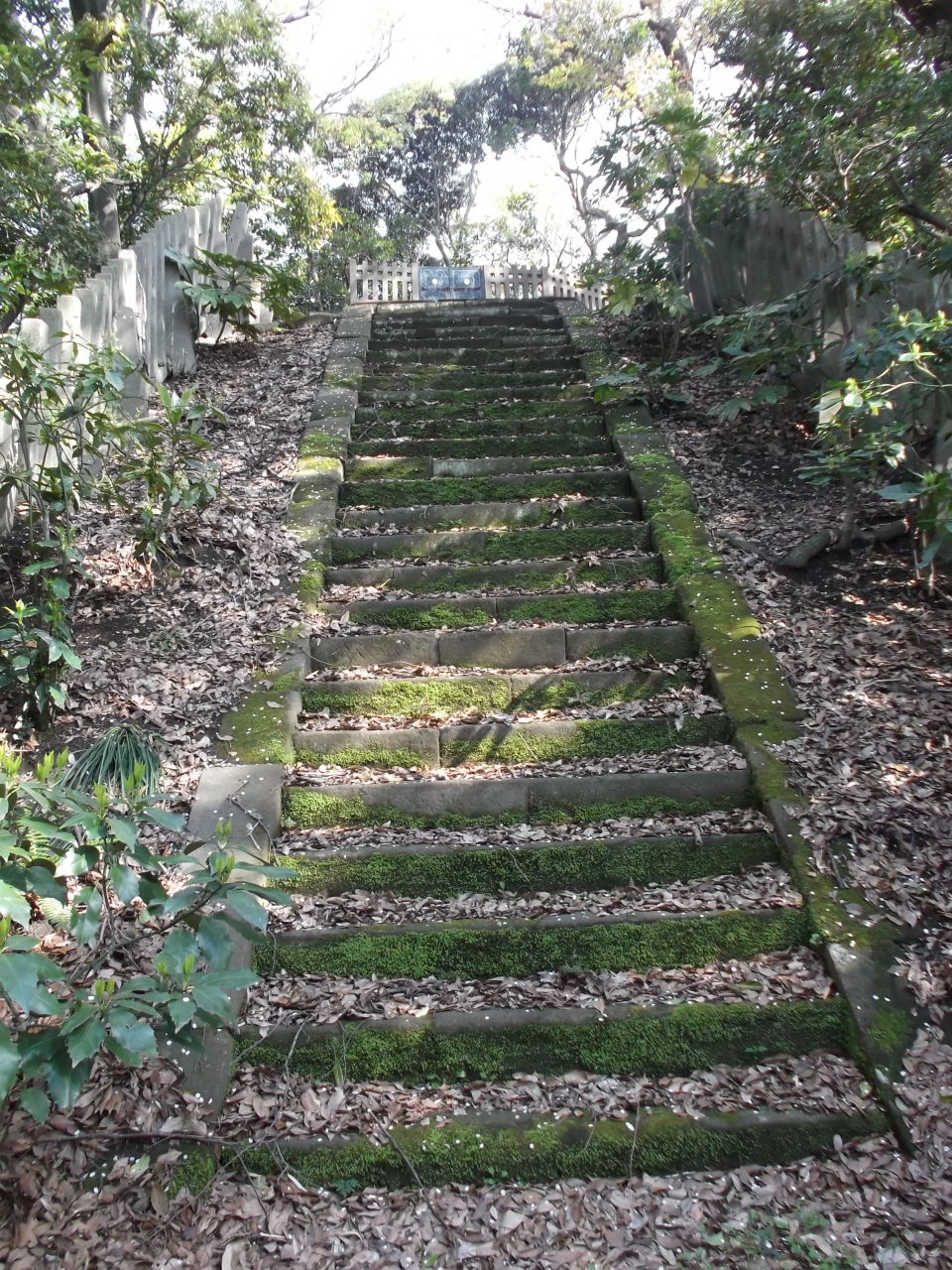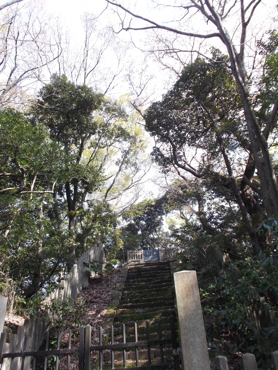 苔生した石畳みと急勾配の石段を登り詰めると、石垣と二重の門(入口)があり行き止まりです。その先の頂きの青い門扉には菊の御紋が見えます。とても厳粛な場、ここは宮内庁管轄です。