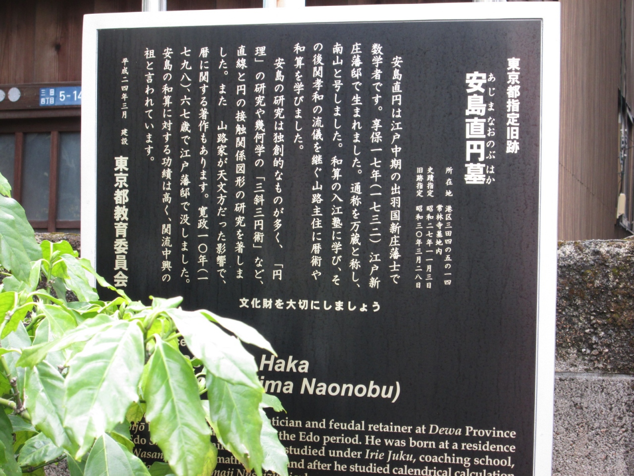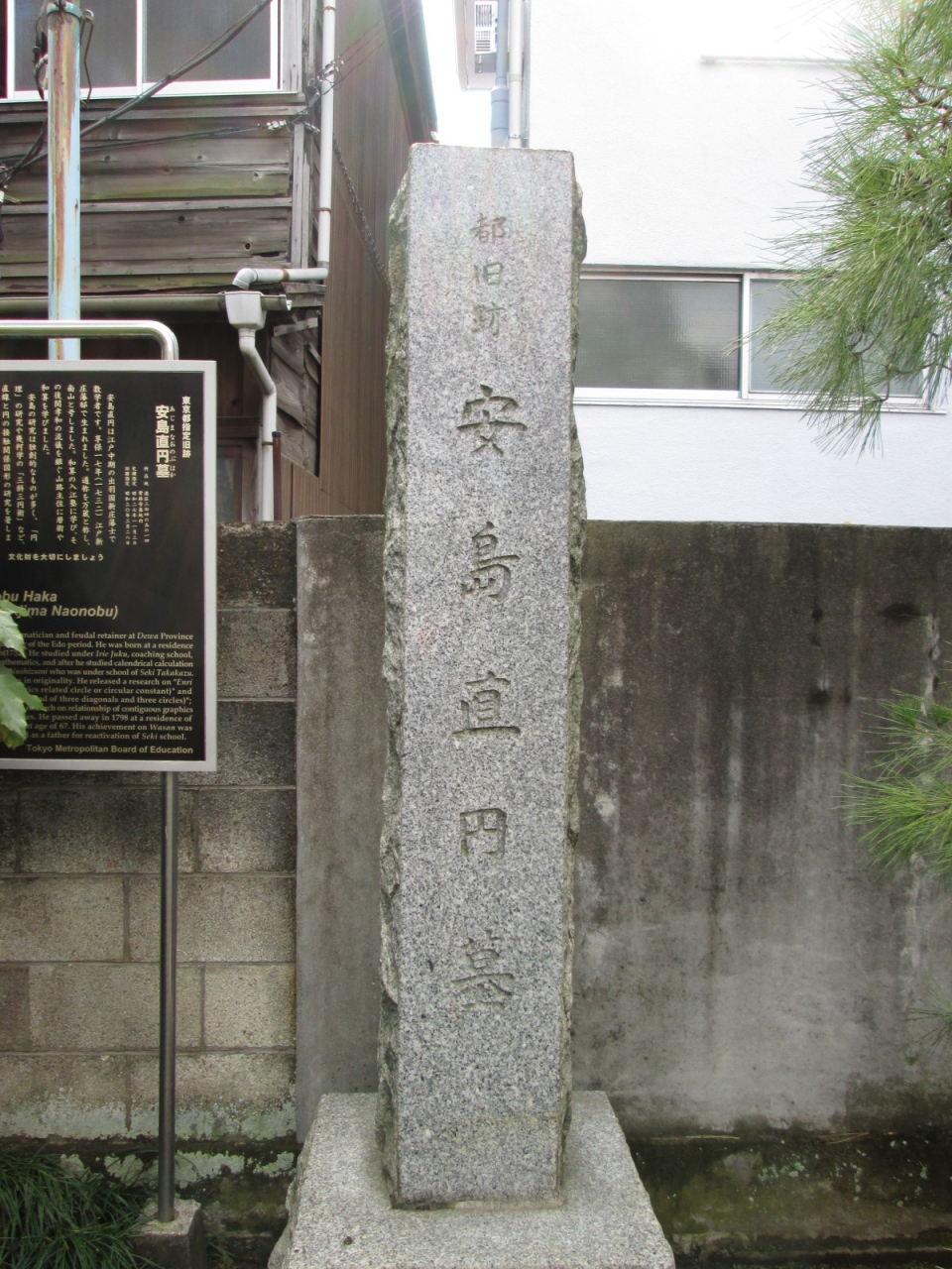 常林寺に「安嶋直円の墓」という史跡看板がありました。看板を読んでみると1732年生まれで、和算とか天文学を極めた方とのこと。史跡看板の横には大きな石柱があり、功績を称えているようでした。こんな方の墓前にめぐり合うとは思っても見なかったので、ちょっと興奮・・・。