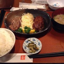 今回は、牛タンとハンバーグの定食1020円を注文。ごはんはお代わり自由で、豚汁と生玉子がついてきます。