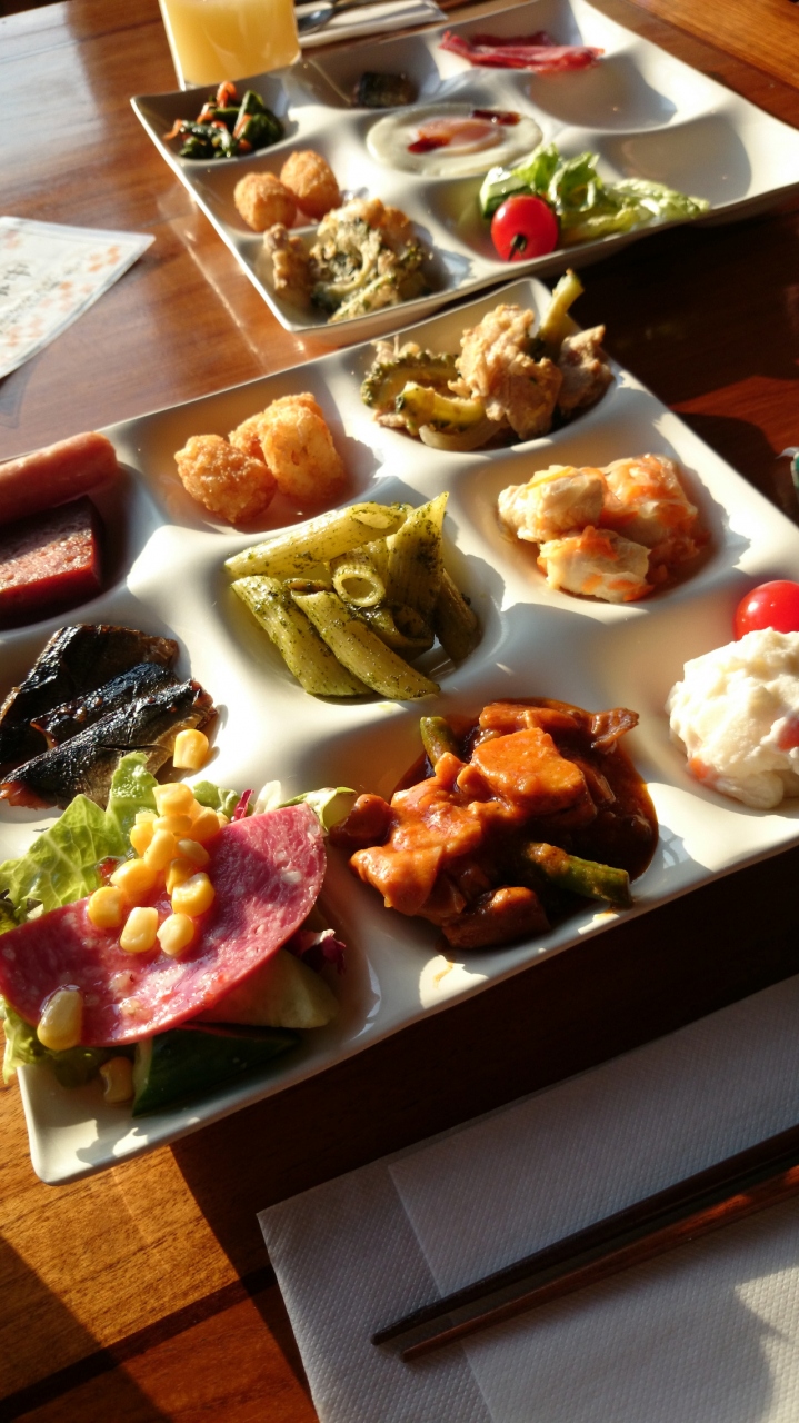 鉄板焼きや天ぷらのコーナーもあり、オーダーすると一皿に人数分を盛り付けてテーブルまで運んでくれます。