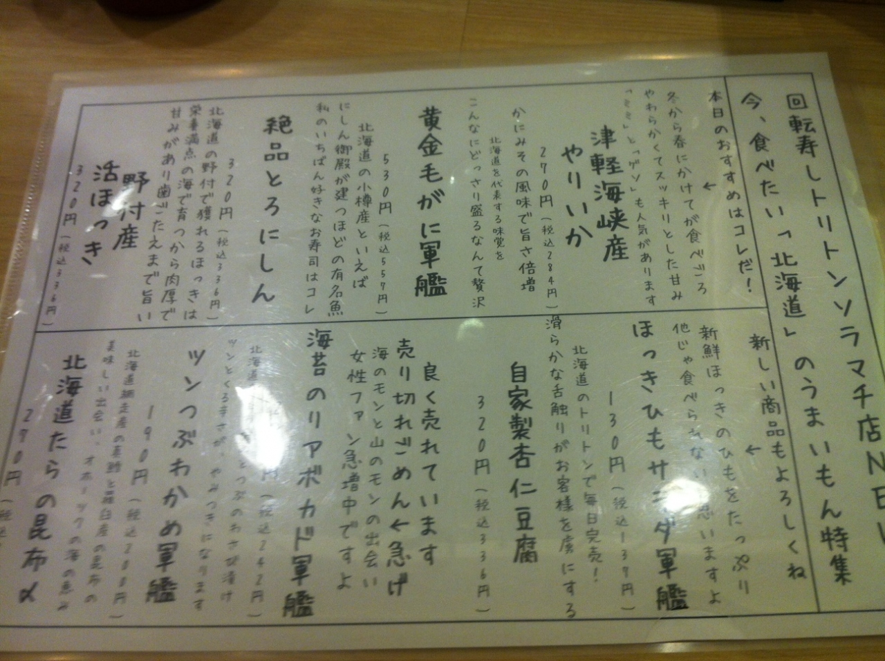 北海道で人気の回転寿司屋さんだそうです。押上で乗り換え時、おなかが空いたので一人でレストラン街へ。お店が空いていたこともありますが、ここは晴海でもないのに「トリトン」て名に違和感を覚え逆に興味が出つつ初入店。そしたら、北海道のお店でした。夕食にはまだ早い時間でがらがら、お寿司は少しは回っていましたが、基本各自が注文。