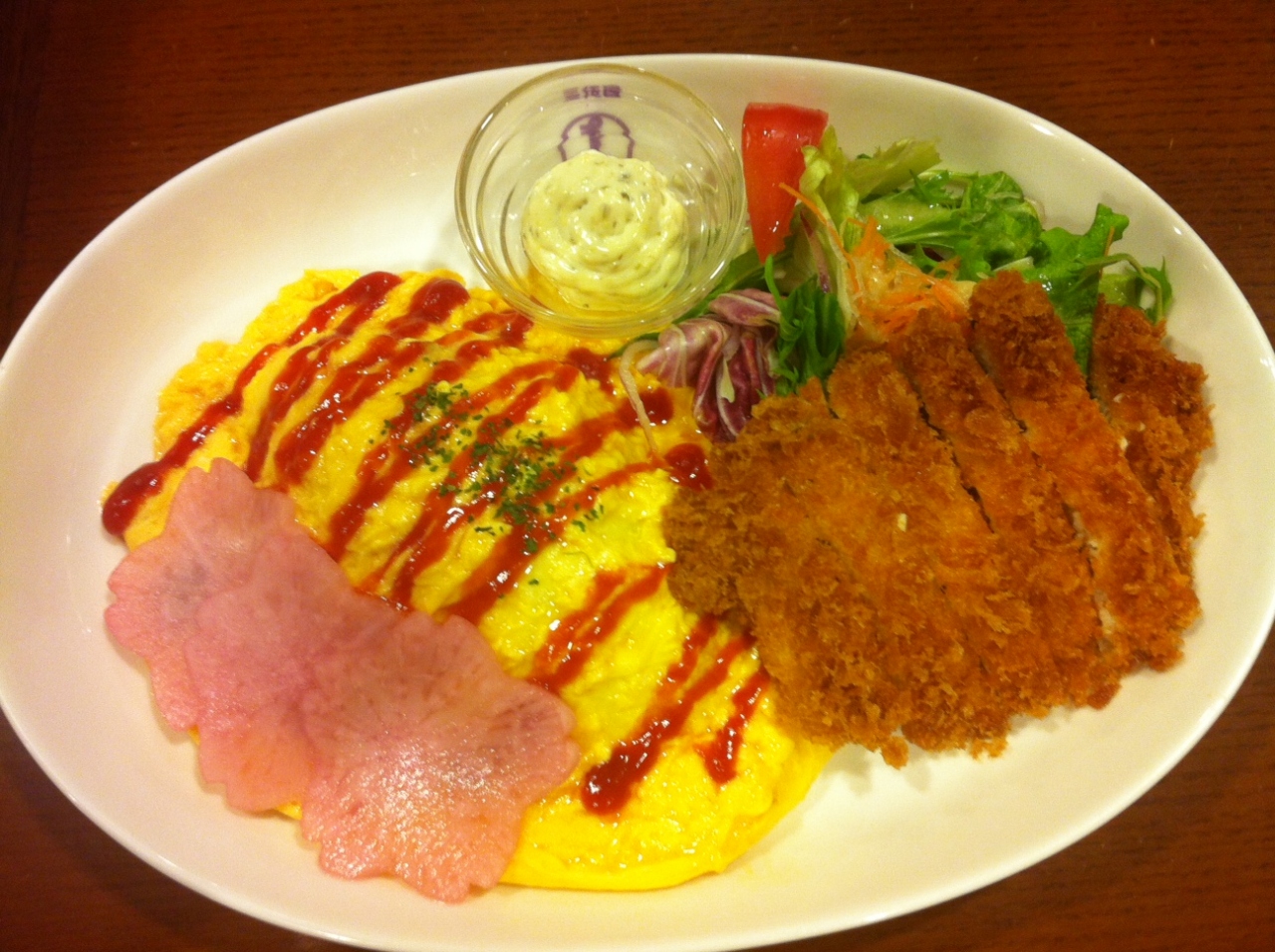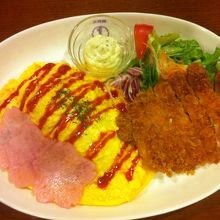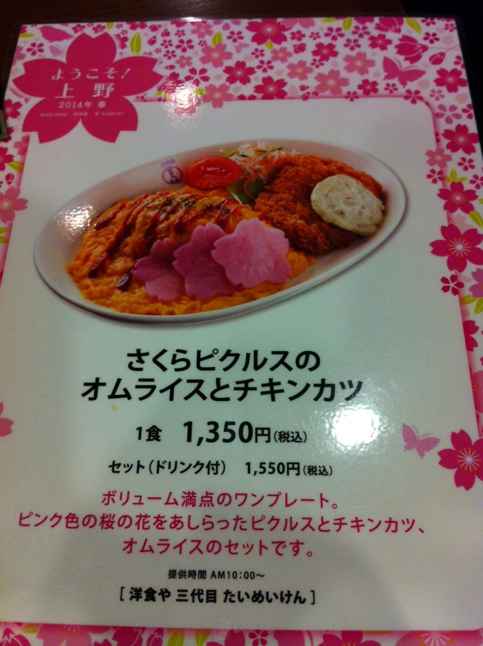 たまには洋食屋もいいでしょう。定番のオムライスにしようとも思いましたが、看板で出ていた春らしいメニューで「さくらピクルスのオムライスとチキンカツ」を注文。