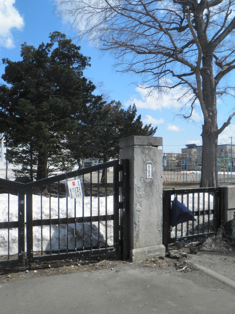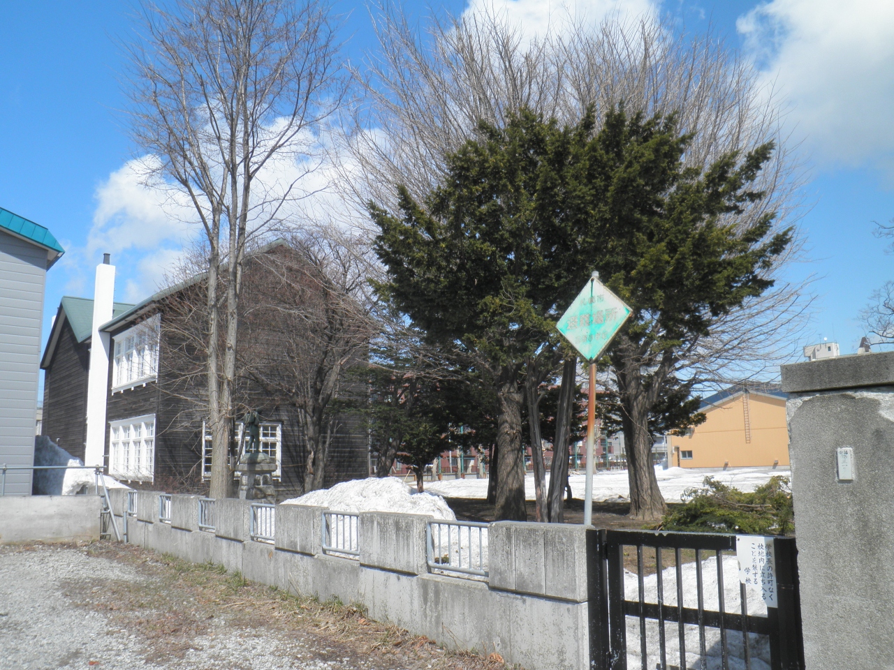 札幌の大通公園の中央バスターミナルから北東方向へ行くバスにのって、苗穂工場の周辺で下りて周囲を散策しました。 苗穂小学校の端に、古い木造の校舎が保存されています。 まだ、4月中旬なので、校舎の周囲には雪が残っていました。 樹木も残されていて、昔の札幌を感じることができました。