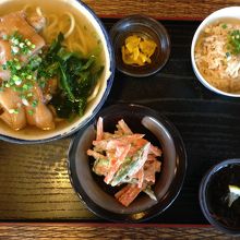 セットには、もずく酢、小鉢のほか、ジューシーが付いてくる。
