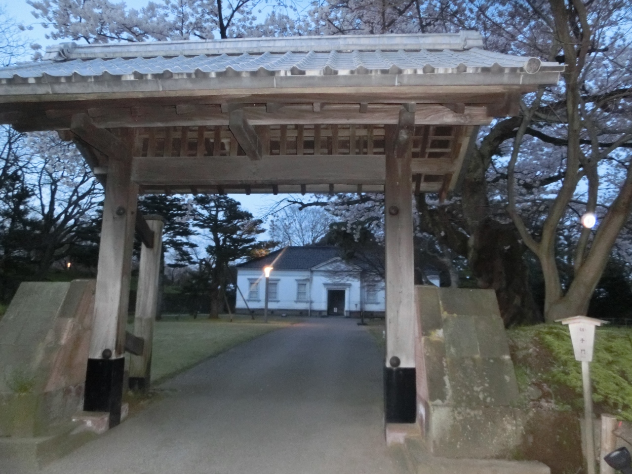 金沢城内にある切手門は、城内に残る旧第六旅団司令部の建物の前にありました。建造年月は不明ですが、金沢城時代から残る門だそうですが、明治維新後に、現在のところに移設されたそうです。すぐそばの桜の木がちょうど満開でとてもきれいでした。