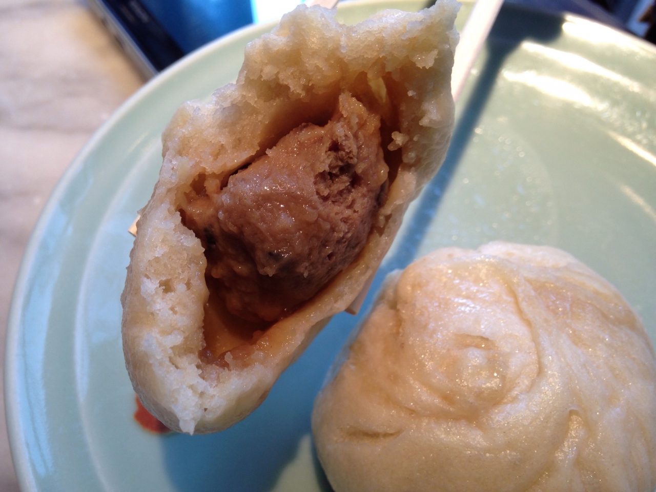 豚まんは一つたったの90円。からしや醤油、酢などを付けて食べても美味しいようですが、私はそのままで十分美味しかったです。小ぶりな豚まんはとってもジューシー。シイタケ入りなのが面白かったです。
