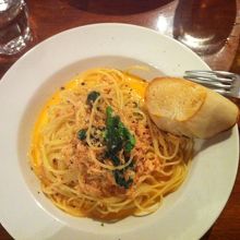 サーモンと菜の花のスパ、サラダ、ドリンク付きで1200円。ま、リーズナブルかな。