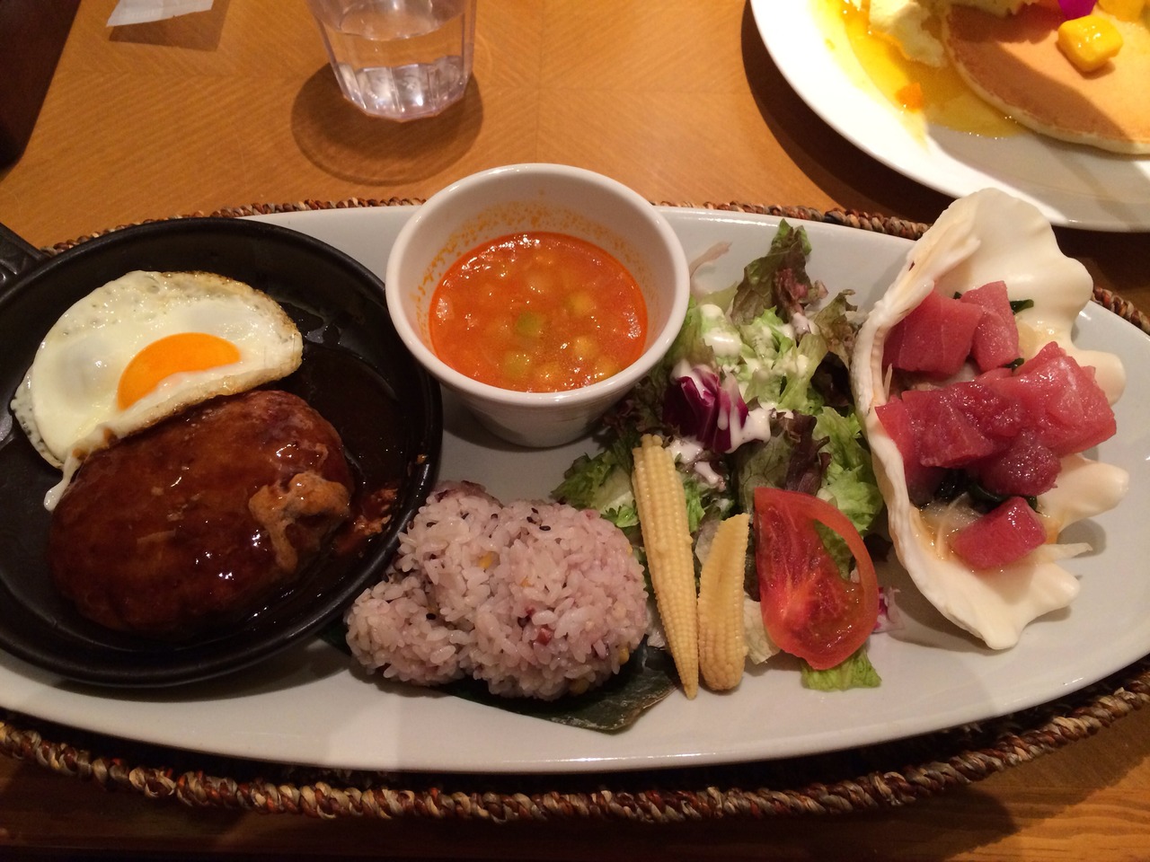 僕はグレービーロコモコとアヒポキのハワイアンプレートをもらいましたが、1580円と場所柄けっこうなお値段です。店内はハワイ時間なのか(笑)料理が出てくるまでにけっこう時間がかかります。ようやくありついたロコモコですが、これが意外なくらい美味しかったです。ハンバーグの肉の詰まった感じが良いですね。