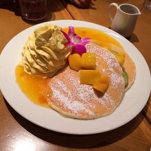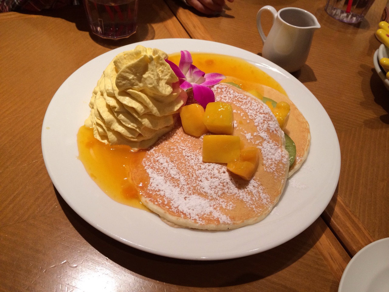 子供達はマンゴーとキウイのパンケーキにかぶりついていました。上に乗った大量のクリームがすごい迫力ですが、とても軽いので、すっとお腹に入ってしまいます。