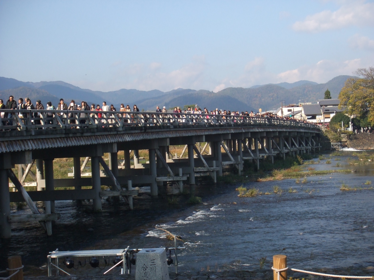 紅葉の時期に行きました。やはり京都まで来たら、嵐山にも足を運びたくなり行きました。覚悟していたとおり人はとっても多かったです。渡月橋もた~~~~くさんの人でいっぱいでした。まわりと歩調をあわせる形で歩きました。でないと歩きにくいです。でも、よくテレビや雑誌で見る渡月橋、実際に行けてよかったです。