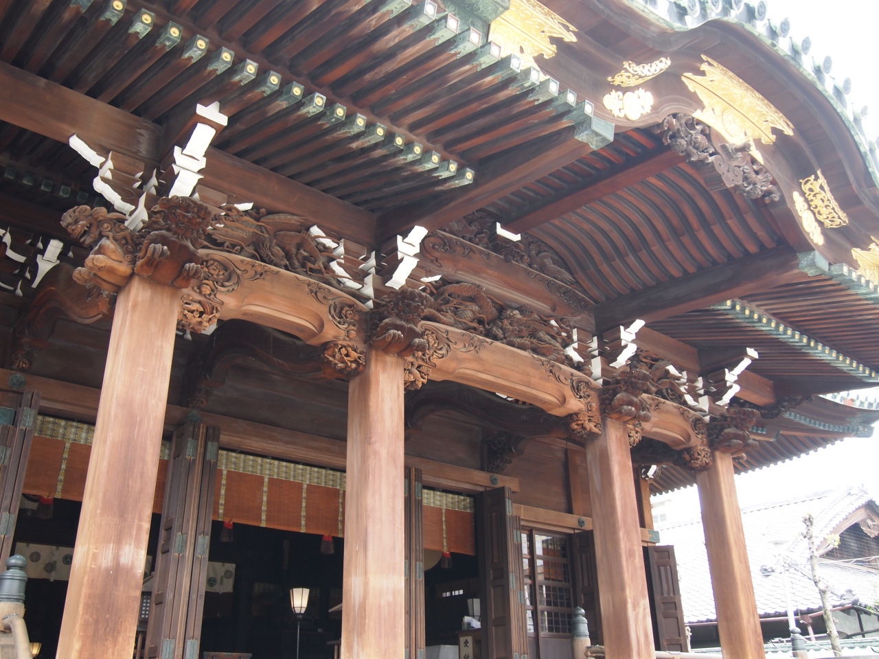 本殿の木の彫刻(なんていうんだろう・・・欄間のような、屋根の下にある部分です)が、さすがに牛ではなくて狛犬みたいな想像上の生き物が彫られているんですが、それがすごく精巧でした。