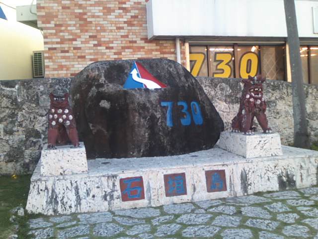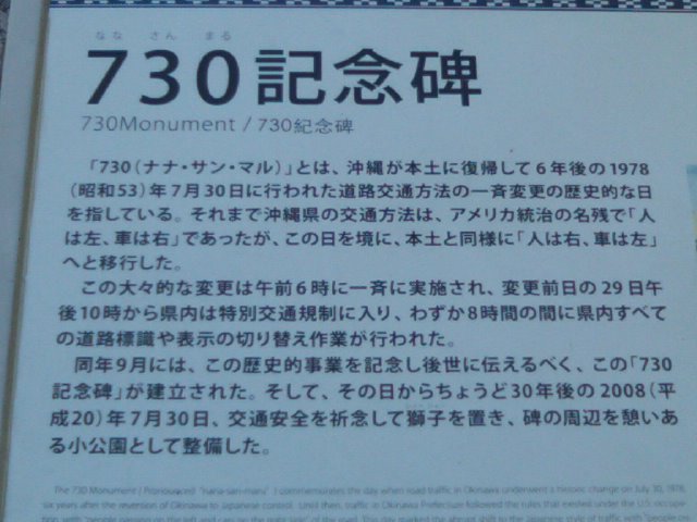 全国的には意外と知られていないことのように思いますが、沖縄では戦後の本土復帰後もしばらくは米式の”人は左、車は右”が続いていました。復帰6年後の1978年7月30日にようやく”人が右(車が左)”になった訳ですが、その日を記念して碑が建てられました。(但し、碑の建立は暫く後のことです。)因みに両脇の獅子に関しては、つい最近、30周年を記念して、交通安全祈願の意も込めて、新たに設置されたものです。