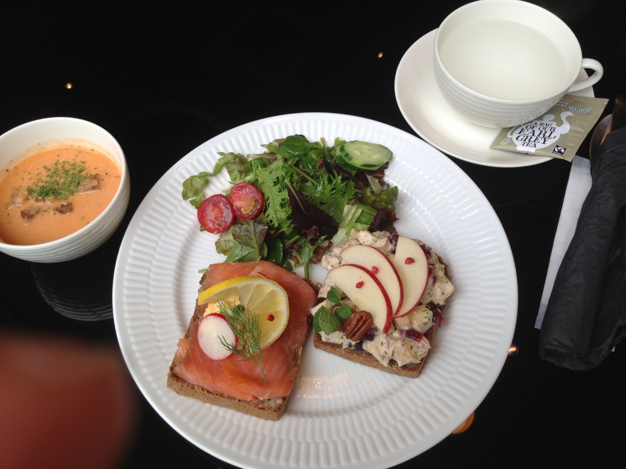スモーブロー(ニコライの出身地デンマークのオープンサンド)、スープ、ドリンクのセットを頂きました。