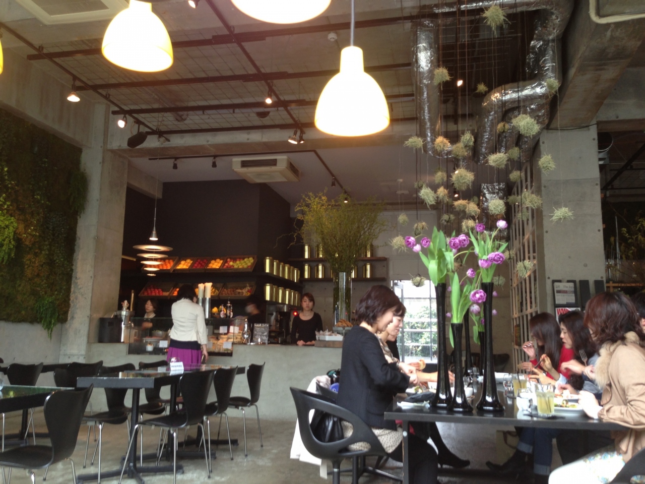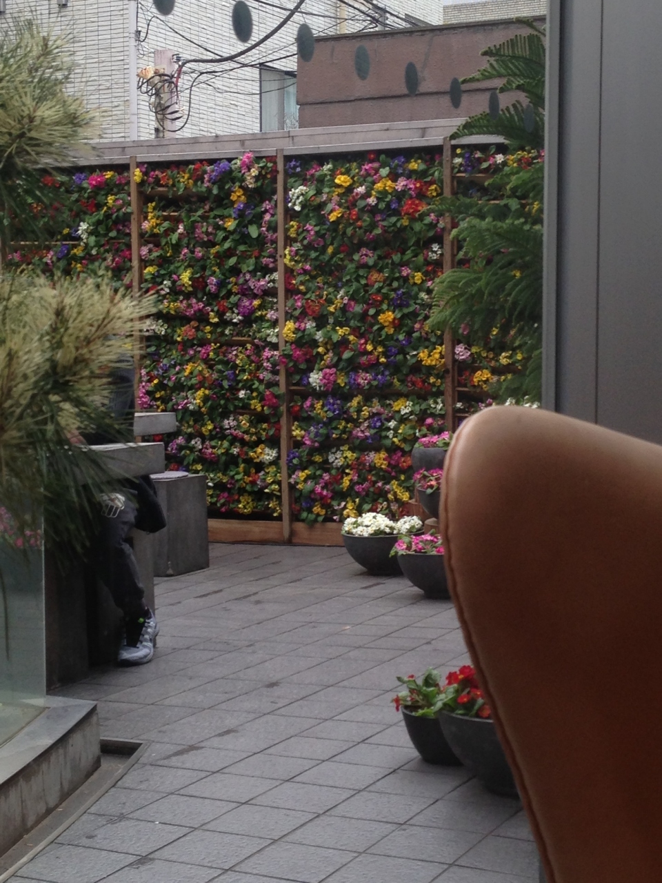 店内は壁一面にグリーン(芝?)が張り巡らされていたり、テーブルのガラス天板の下に季節のお花がアレンジされていたり(私が利用した席は少し広めの木のテーブルだったので、アレンジはありませんでしたが)、テラス席の壁面や鉢植えなども春の花でいっぱいでした。
