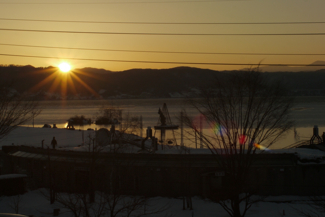 入浴後バルコニーに出てみると、ちょうど日没時刻できれいな夕陽が見えました。