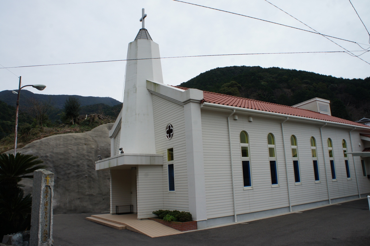 真手ノ浦教会は、上五島にある29の教会の一つで、道土井湾を望む丘の上。奈良尾からも遠くないし、国道から少し入ったところなので、交通の便は悪くないのですが、国道から教会までの道は細いし、とても分かりにくい。カーナビで位置を確かめながら向かったのですが、かなり苦労しました。