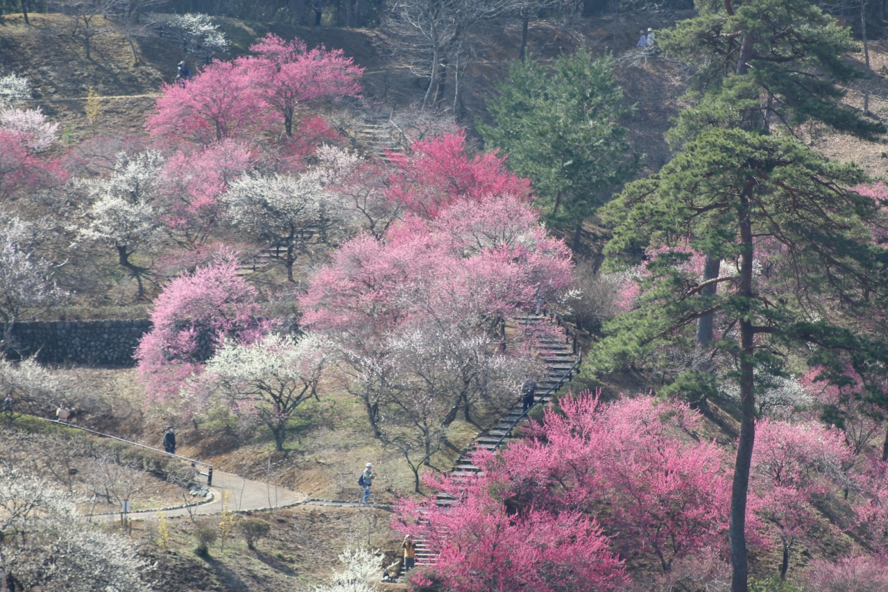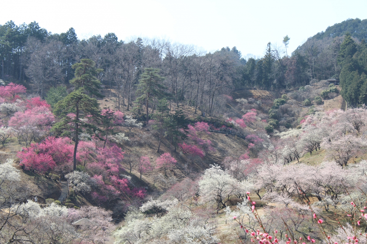 梅の感染症のため、今年4月に「梅の公園」内のすべての梅の木が伐採されてしまい暫く観ることが出来なくなるので梅が満開の頃行ってきました。「梅の公園」はJR青梅線日向和田駅から徒歩10分程です(駅から丘陵にある梅園が見えます)。JRの「えきぽ」の「青梅の梅を訪ねて」を参考に周辺の寺院の散策も悪くありません。「梅の公園」前の小高い丘から公園を見下ろせますのでまずそちらに行くといいと思います。公園内は見渡す限り梅・梅・梅です。