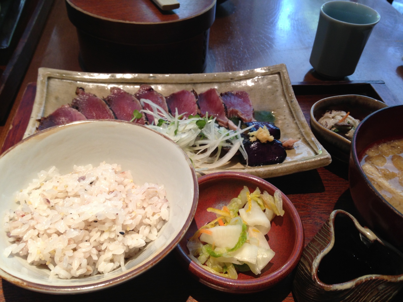桜の季節は終わっていましたが庭がきれいです。アメリカ大使館と隣接しているので庭の横をお巡りさんがよく通ります。ご飯が五穀米で自然薯(とろろ)がついてポイントが高いです。お味噌汁のお椀がどんぶり並みの大きさです。値段はランチでも1,500円前後で高めですがカツオのたたきに大根おろしだけでなく、もみじおろしも付いており納得の価格でした。