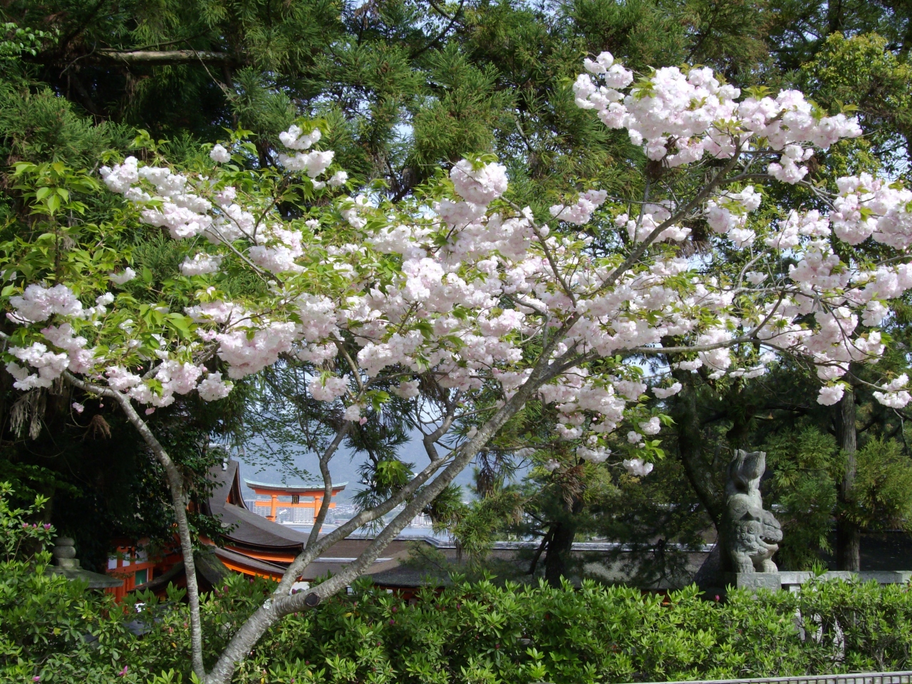 4月下旬で、安芸の宮島の桜の季節の終わりごろではありましたが、きれいな八重桜が咲いていました。八重桜の向こうに宮島の大鳥居が見える写真をアップいたします。平日でしたので観光客もすくなめで、ゆっくり党内を散策しました。