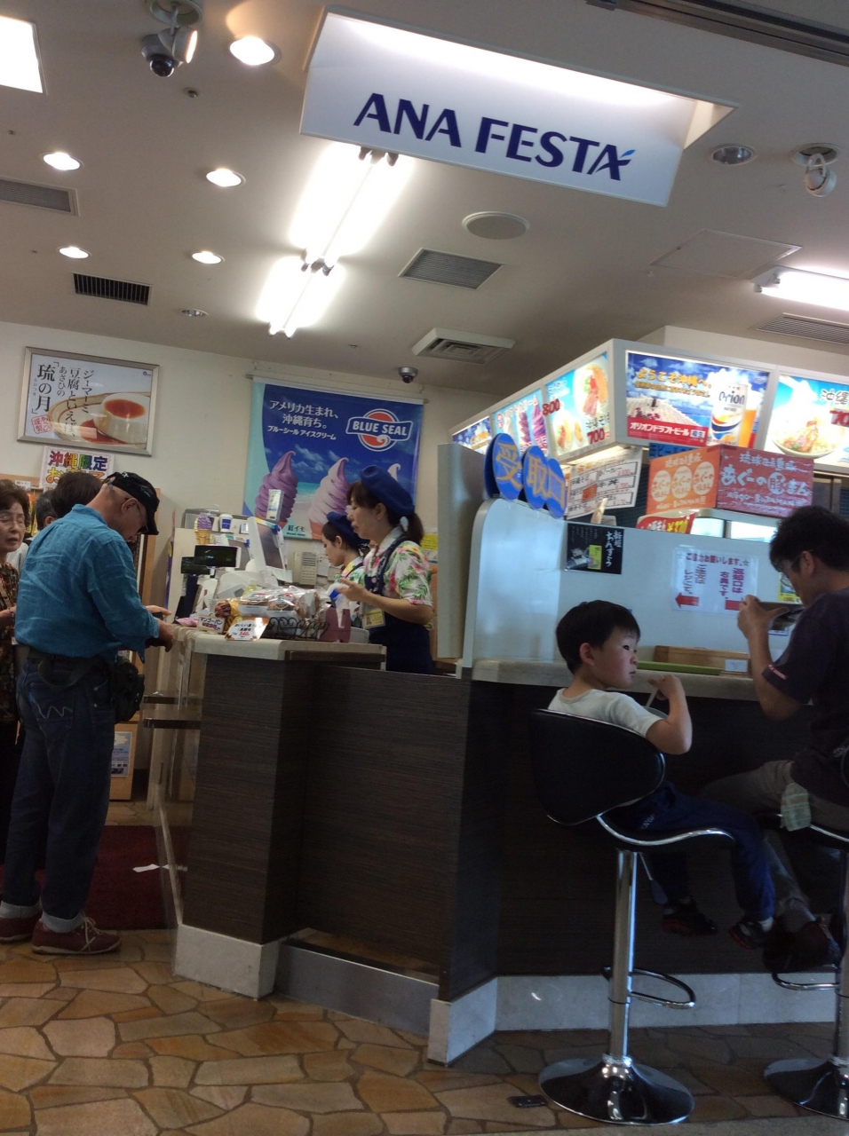ソフトクリーム、沖縄そば、牛丼、カレーライス、オリオンビールなどが販売されており、それを、狭い店内で、3人でさばいていました。常にごった返しています。