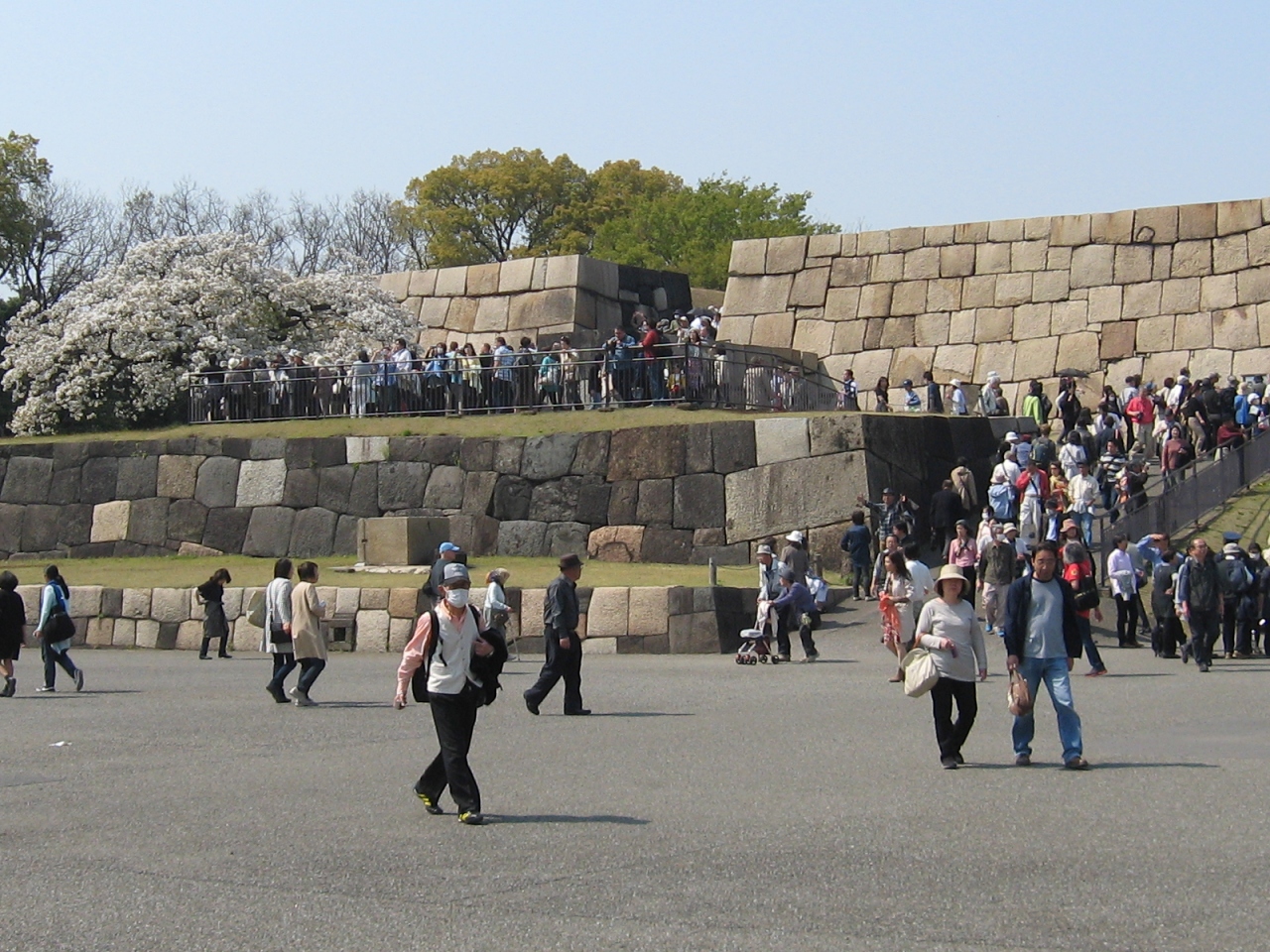 北詰橋門から皇居東御苑に入ると、しばらくして右手に巨大な石垣組が現れた。これが江戸城本丸跡である、現在はこの石垣の上がに江戸城を偲ばせるあとが残る。1863年の火災以降再建されないまま時が過ぎたのだ。上から見ると今は大庭園が広がる。
